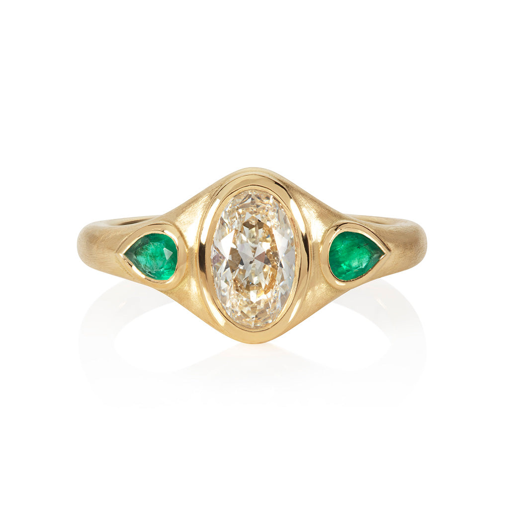 This bespoke champagne oval engagement ring has an ancient feel and an easy to wear modern profile. At its heart sits a champagne oval diamond - framed by pear emerald accents in a curvy gold design.