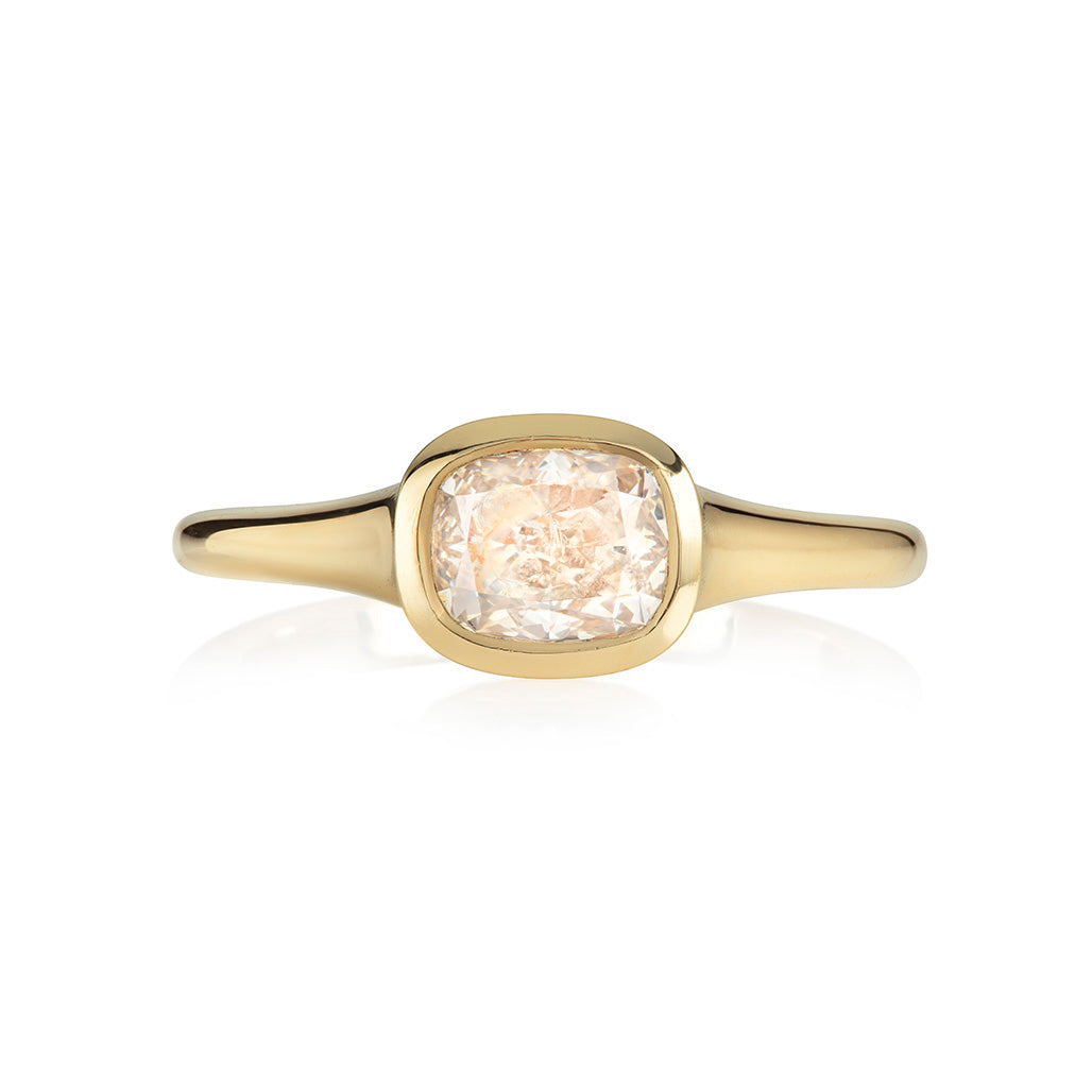 - Featuring a softly glowing golden cushion diamond set east west in a curvy minimal gold band.