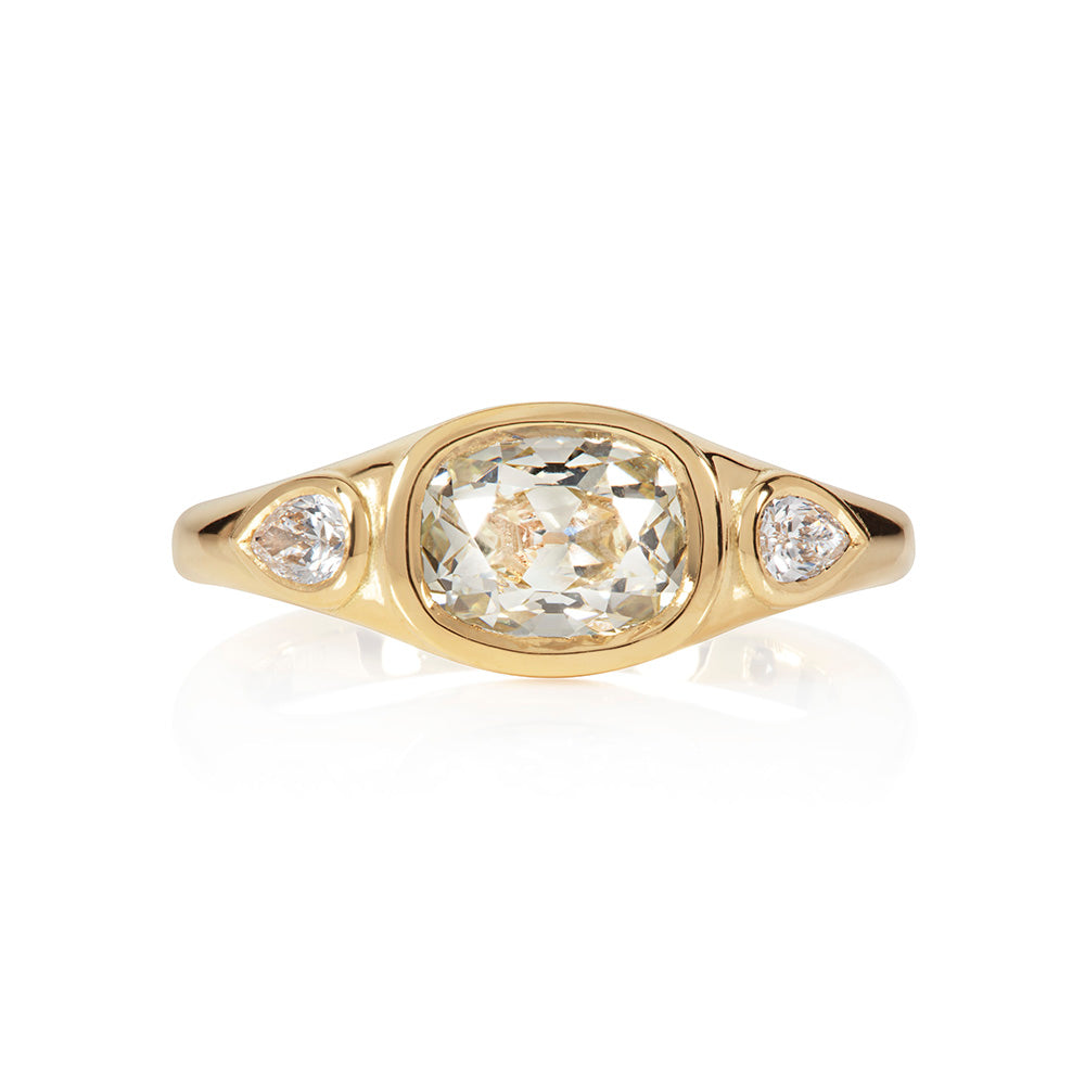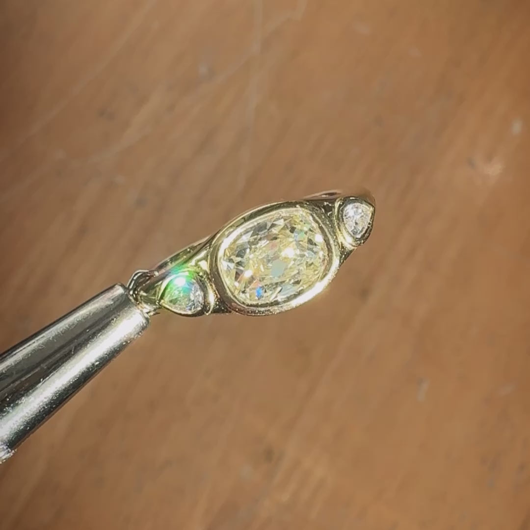 This bespoke design has a soft carved profile set with an Antique Old Mine Cut Elongated Cushion Diamond offset by white pear side stones