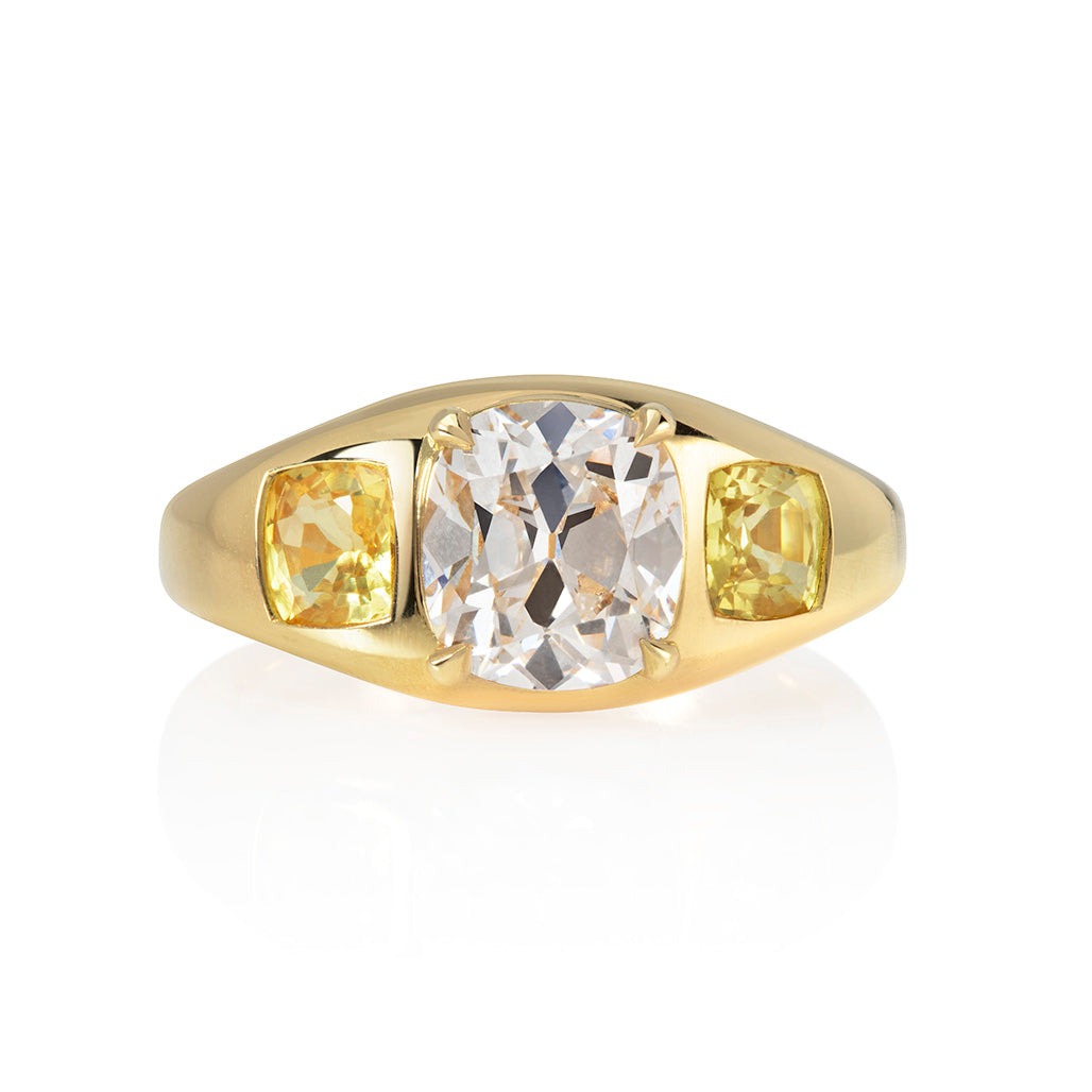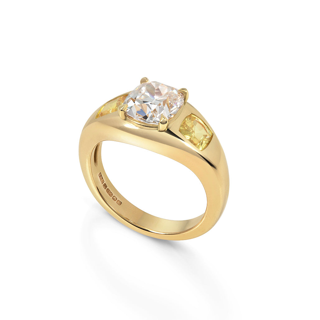 - At its heart sits a striking cushion diamond - framed by yellow sapphire side stones.