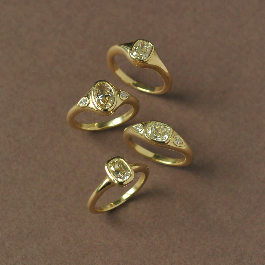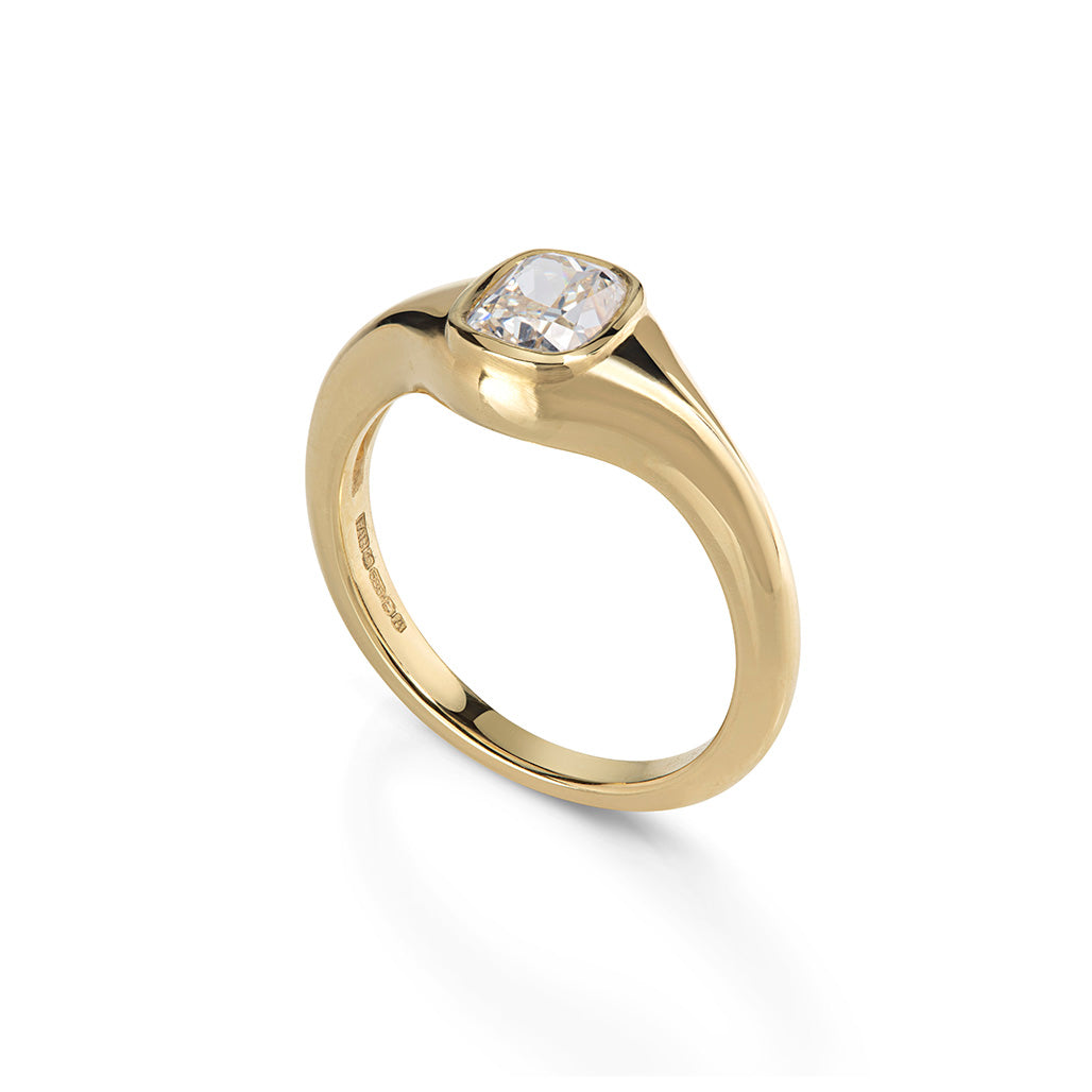 - Featuring a beautifully glowing GIA Certified natural cushion cut diamond with a natural tint. Set in a smooth, carved minimal gold band.